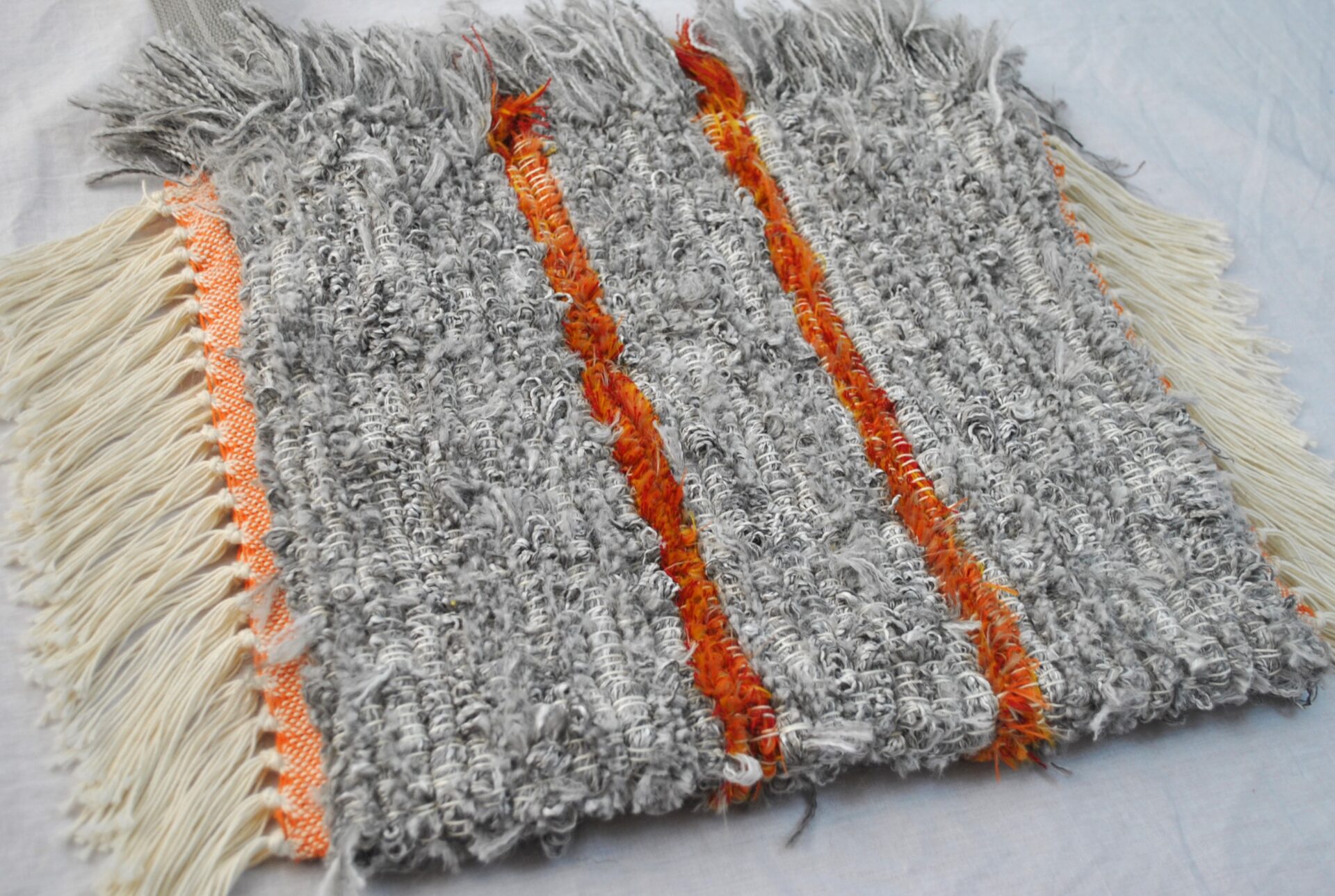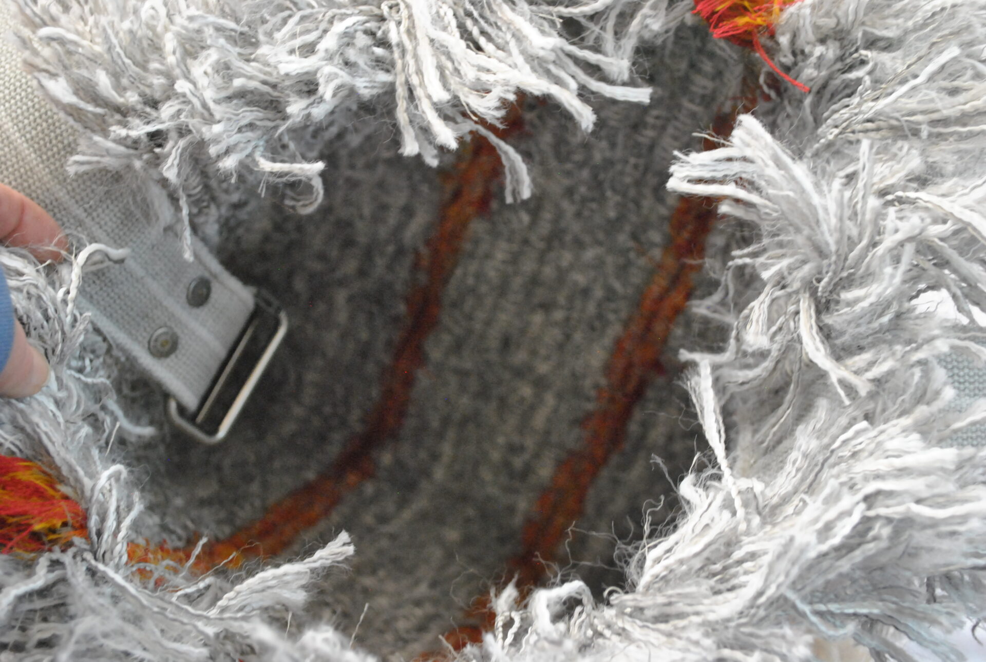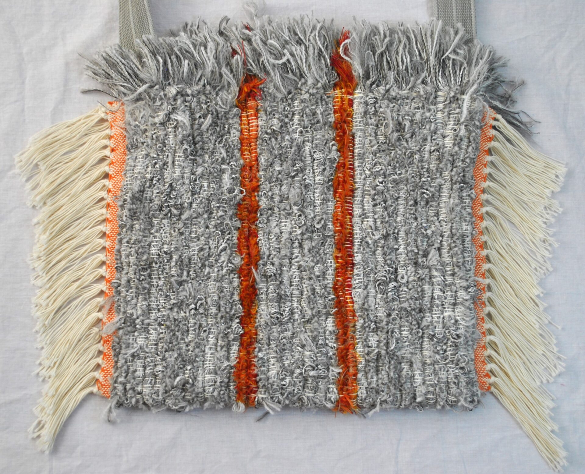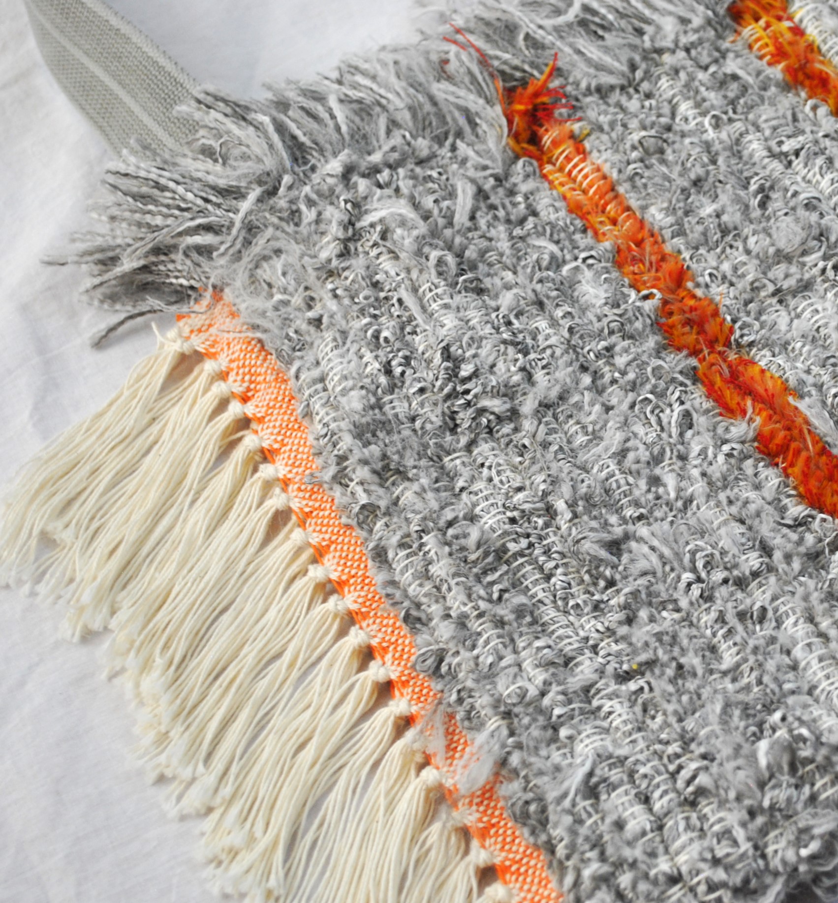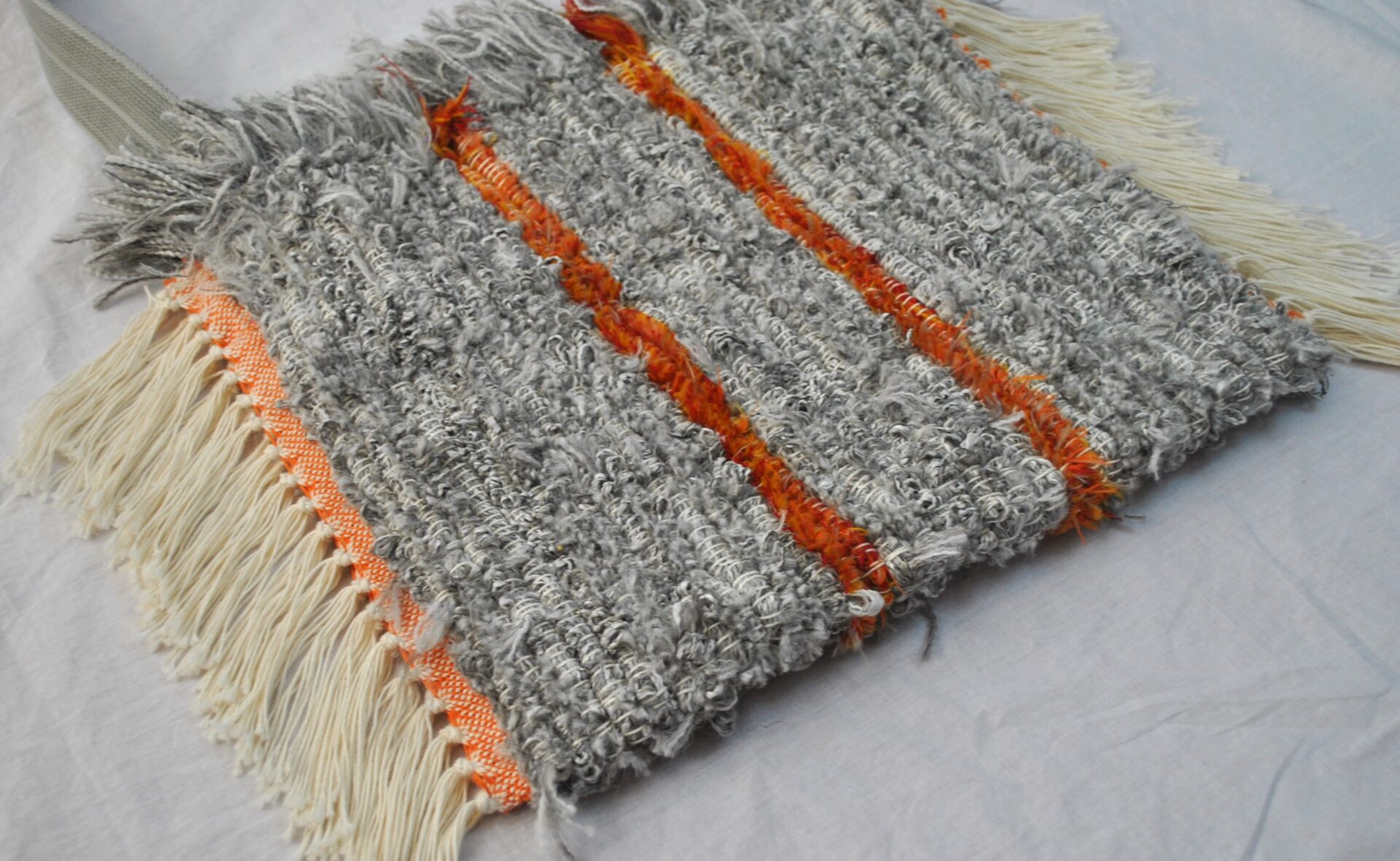 You will definitely be the only one at the farmer’s market with this tote bag! The generous inside space helps with running errands and keeping many items close at hand. The fluffy softness of the top is a treat for your hands plus a privacy feature to block visibility. The matching heavy-duty strap had an earlier life as a belt, and is sized for cross-body or shoulder use. The functional metal loop inside (see inner picture) could secure an assortment of items with a lanyard or carabiner. The pattern carries on to the inside and reverse. The 100% cotton fringed sides are as soft and luxurious as the inner and outer layers, and the pop of orange at the fringe is a fun coordinating detail with the understated orange stripes of the body. Certainly a unique bag that will serve you well for many years!