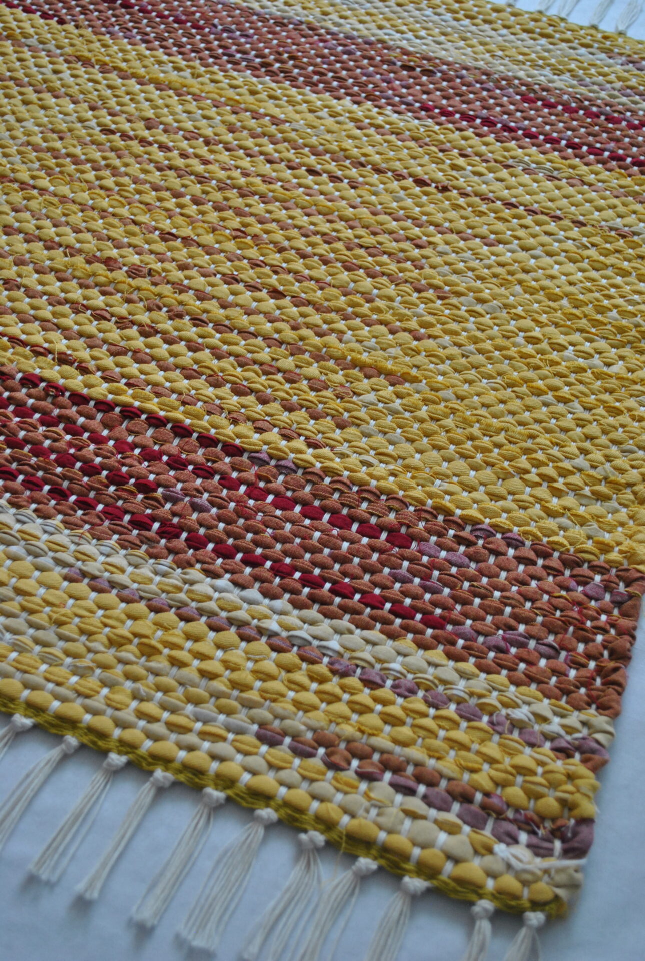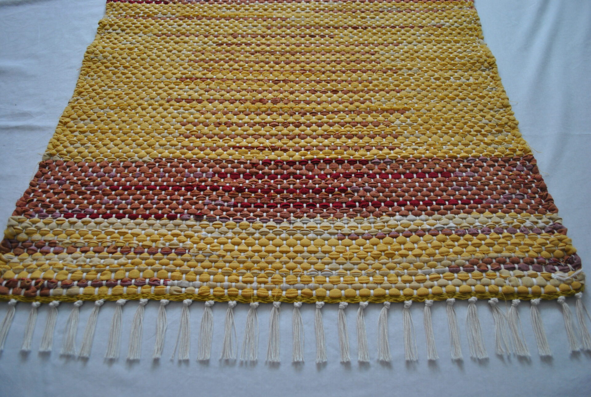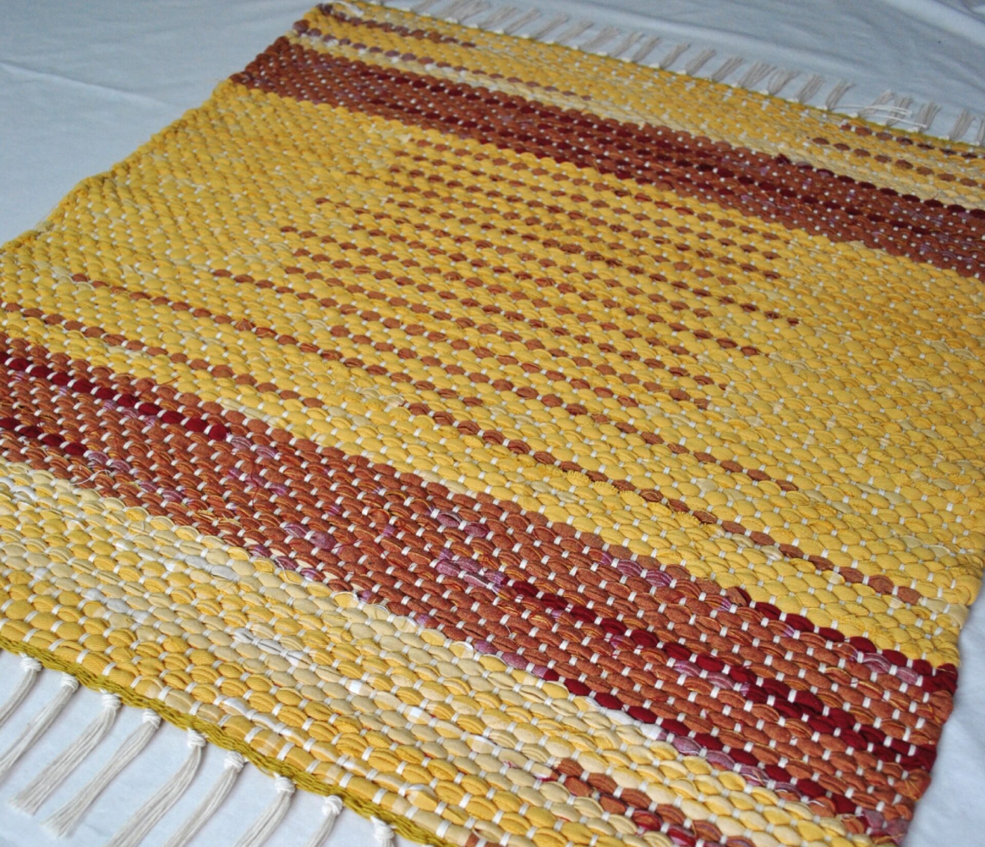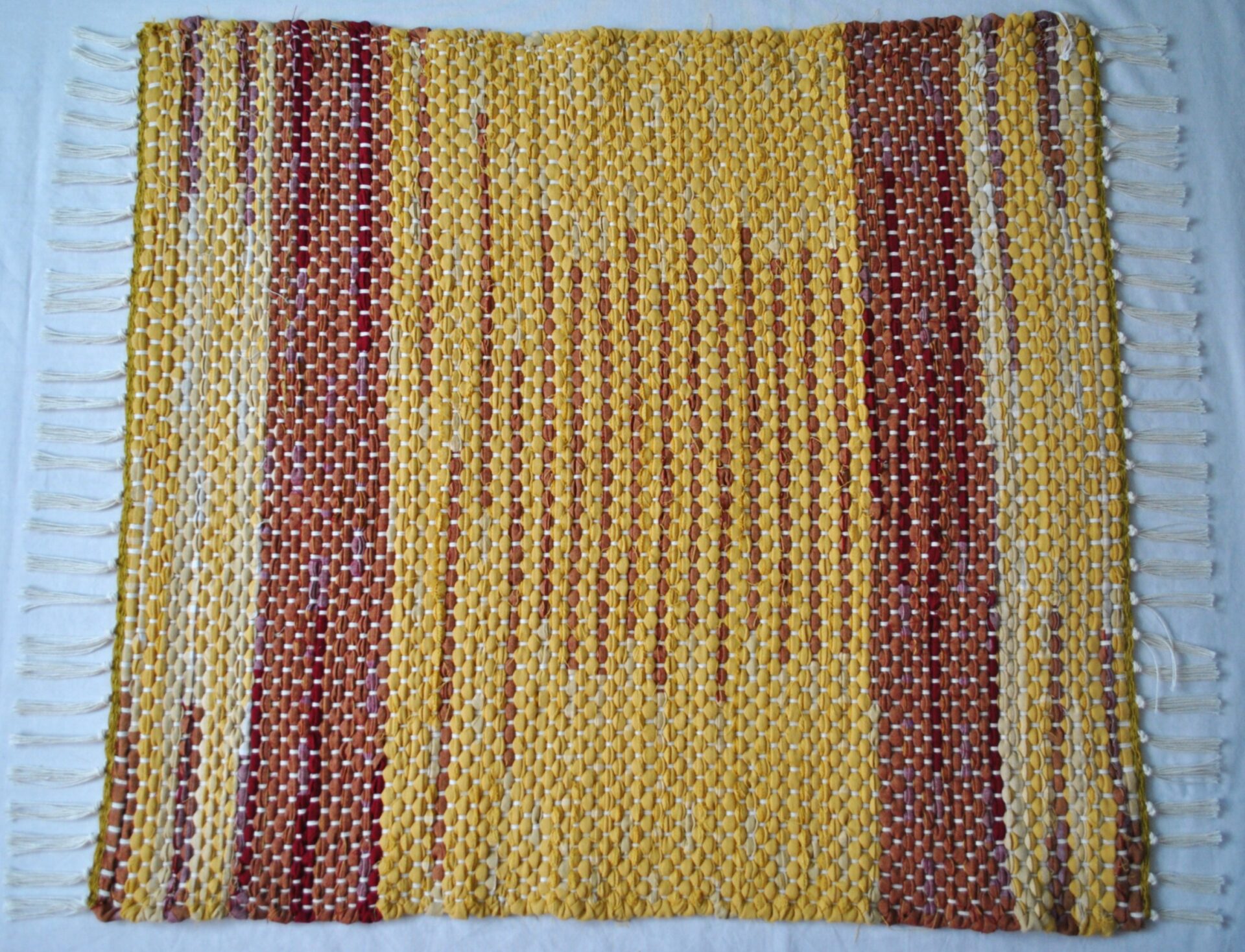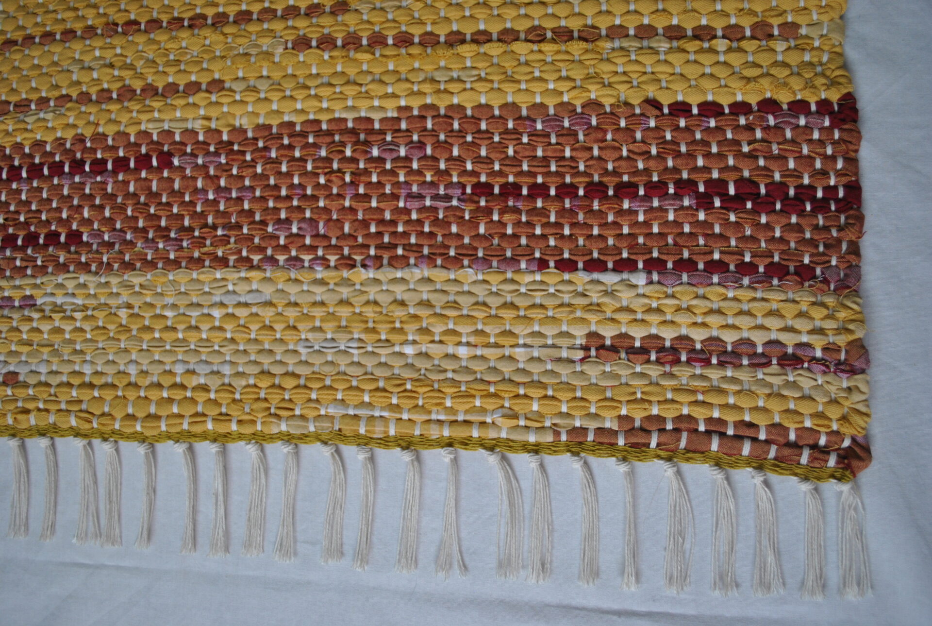 This rug’s fabric used to be a tablecloth, so it’s fitting that it looks like stripes of ketchup and mustard! Joined with a classic white fringe and warp strings, the unique placement of the stripes can shine. This small but mighty rug can do serious work in the kitchen, bathroom, bedroom or entry way, or could be a feature piece at the cabin – where you’ll be roasting hot dogs, I assume!