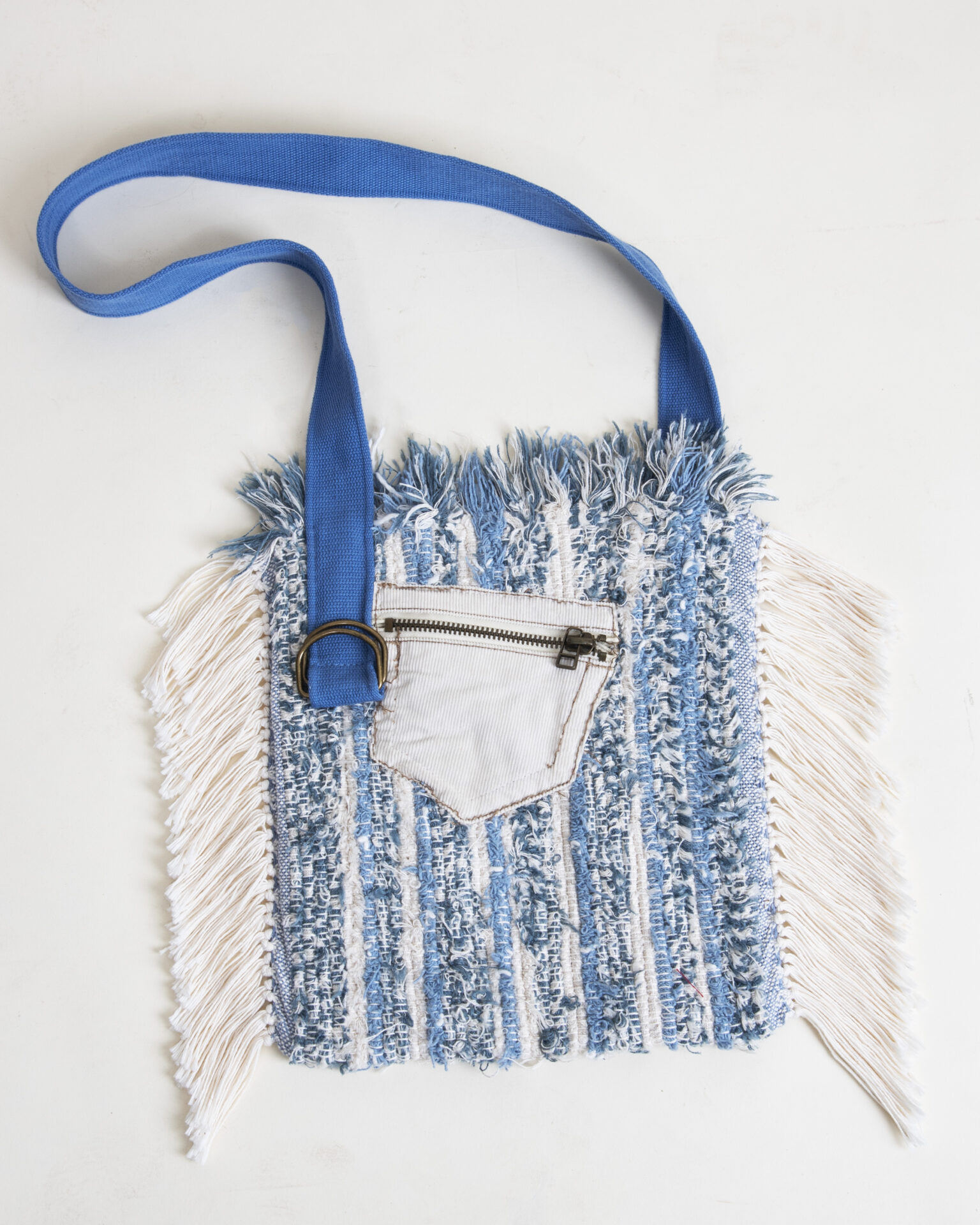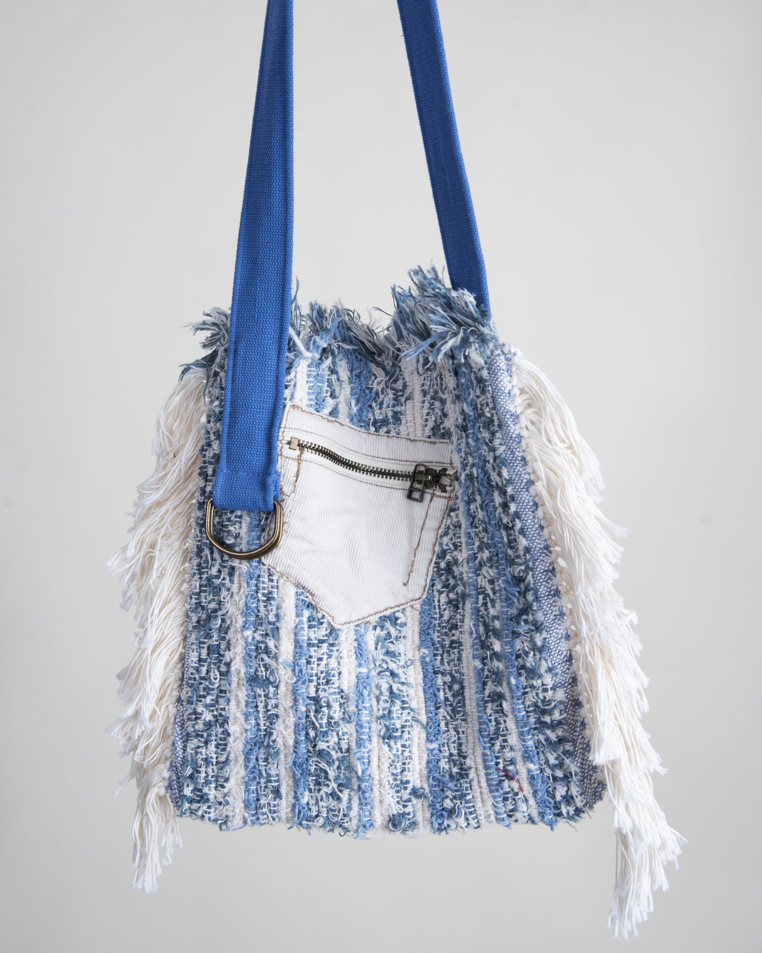 Stand out from the crowd with this funky and functional tote bag, which could be a purse, laptop bag, shopping tote, baby’s diaper bag, or an eye-catching way to carry papers and files to your next meeting. A working, zippered, exterior pocket offers a secure place for keys, money, or other valuables. The delightfully askew pocket is repurposed corduroy, and the bright, heavy-duty strap had an earlier life as a belt. The functional metal loops could hold an assortment of items close at hand with a lanyard or carabiner, and the strap is long enough for cross-body use. The pattern carries on to the inside and reverse. The 100% cotton fringed sides are as soft and luxurious as the inner and outer layers.