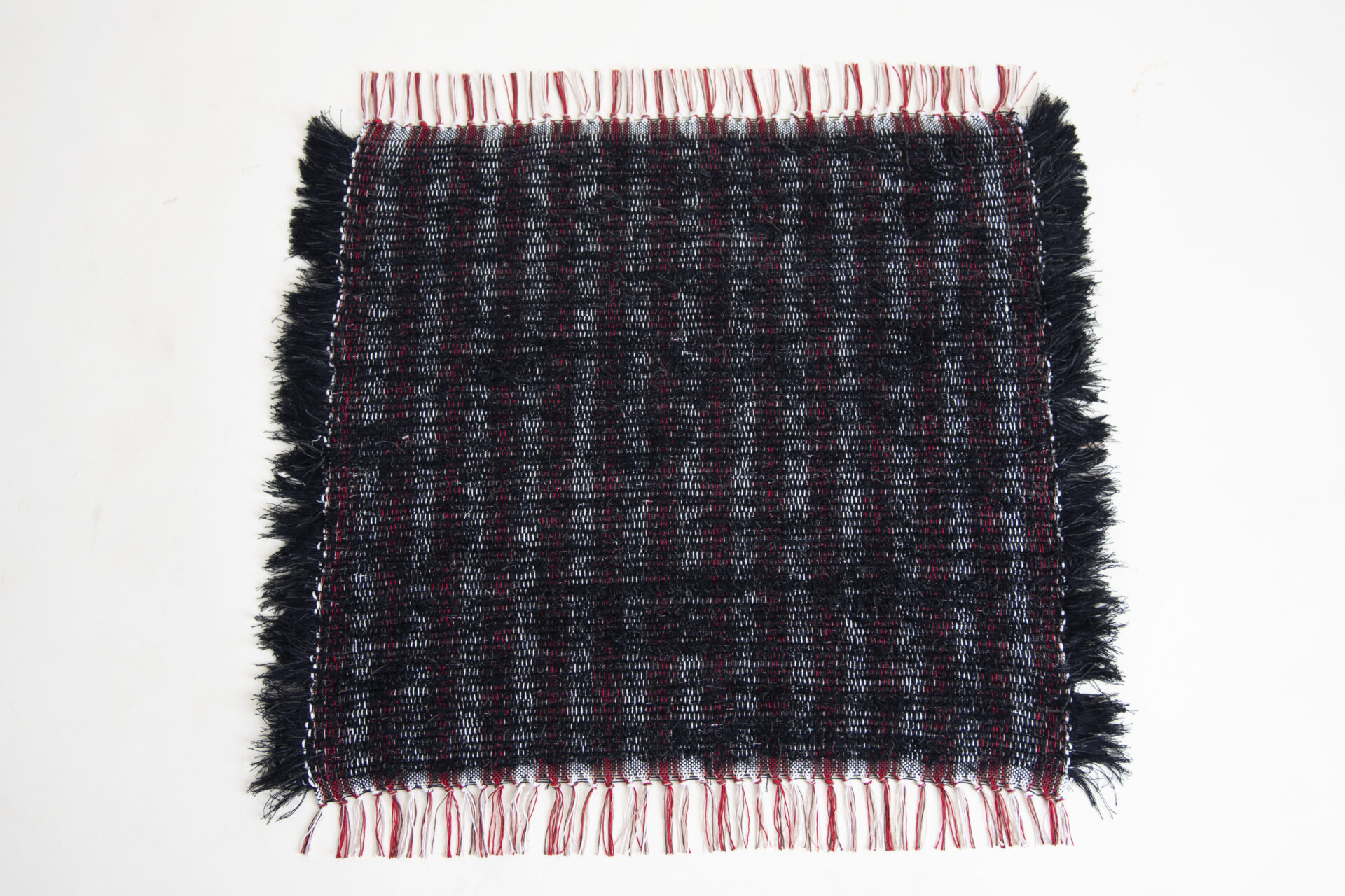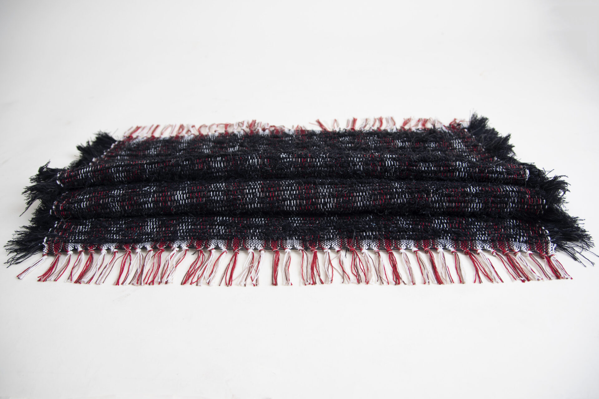 This smaller sized rug is in timeless fluffy black with just a touch of glitter. The red accent strings in the warp and fringe make this a festive item to jazz up your bedroom, bathroom, front door or living space!
