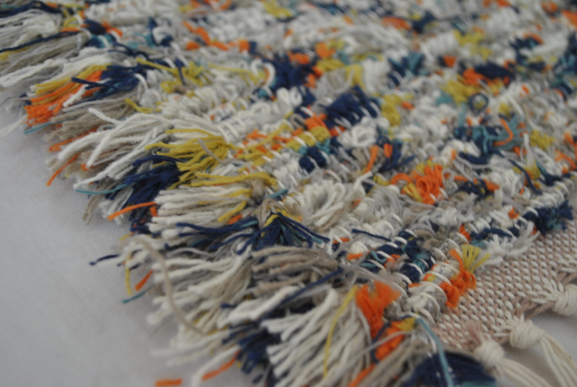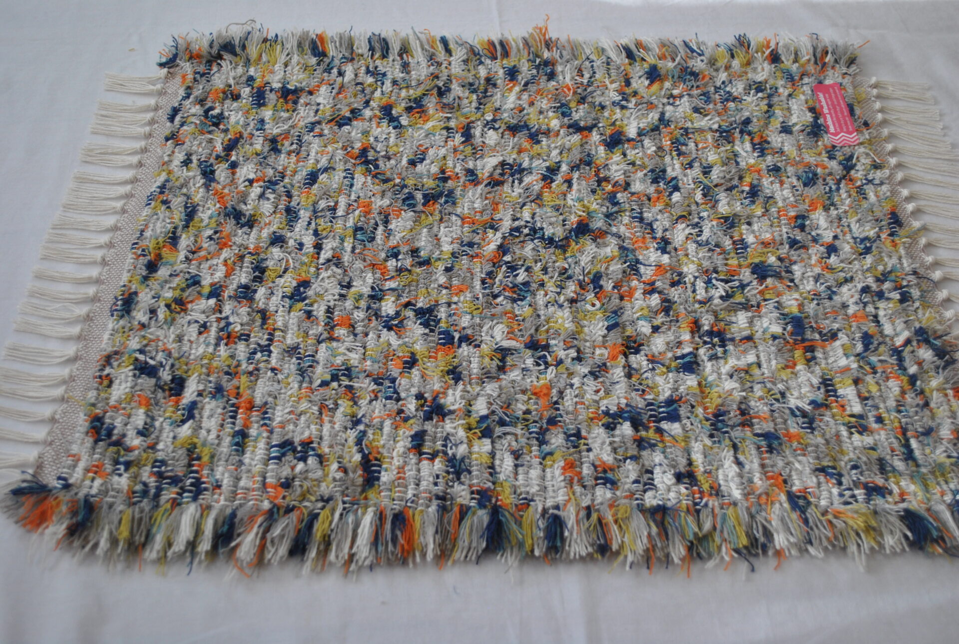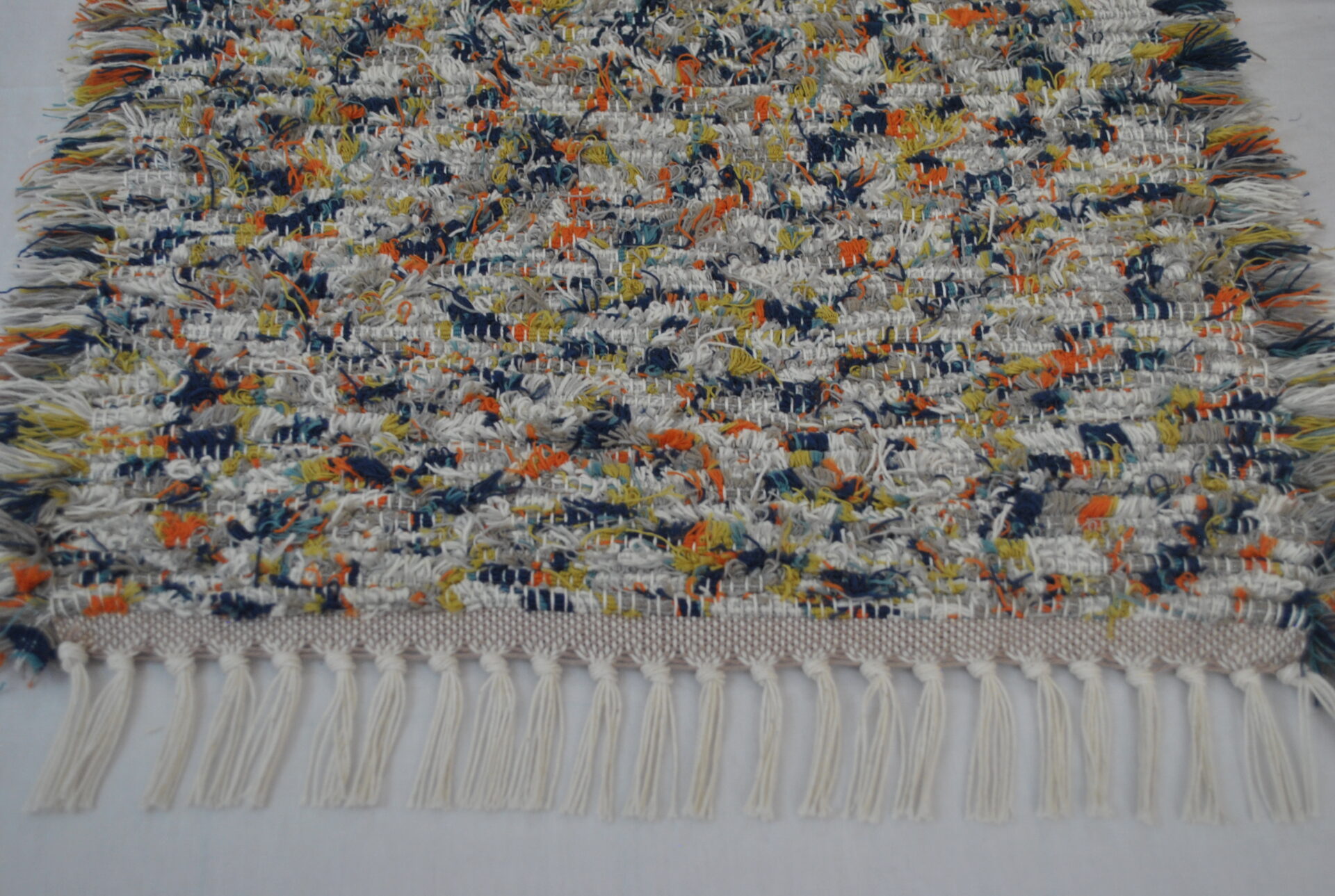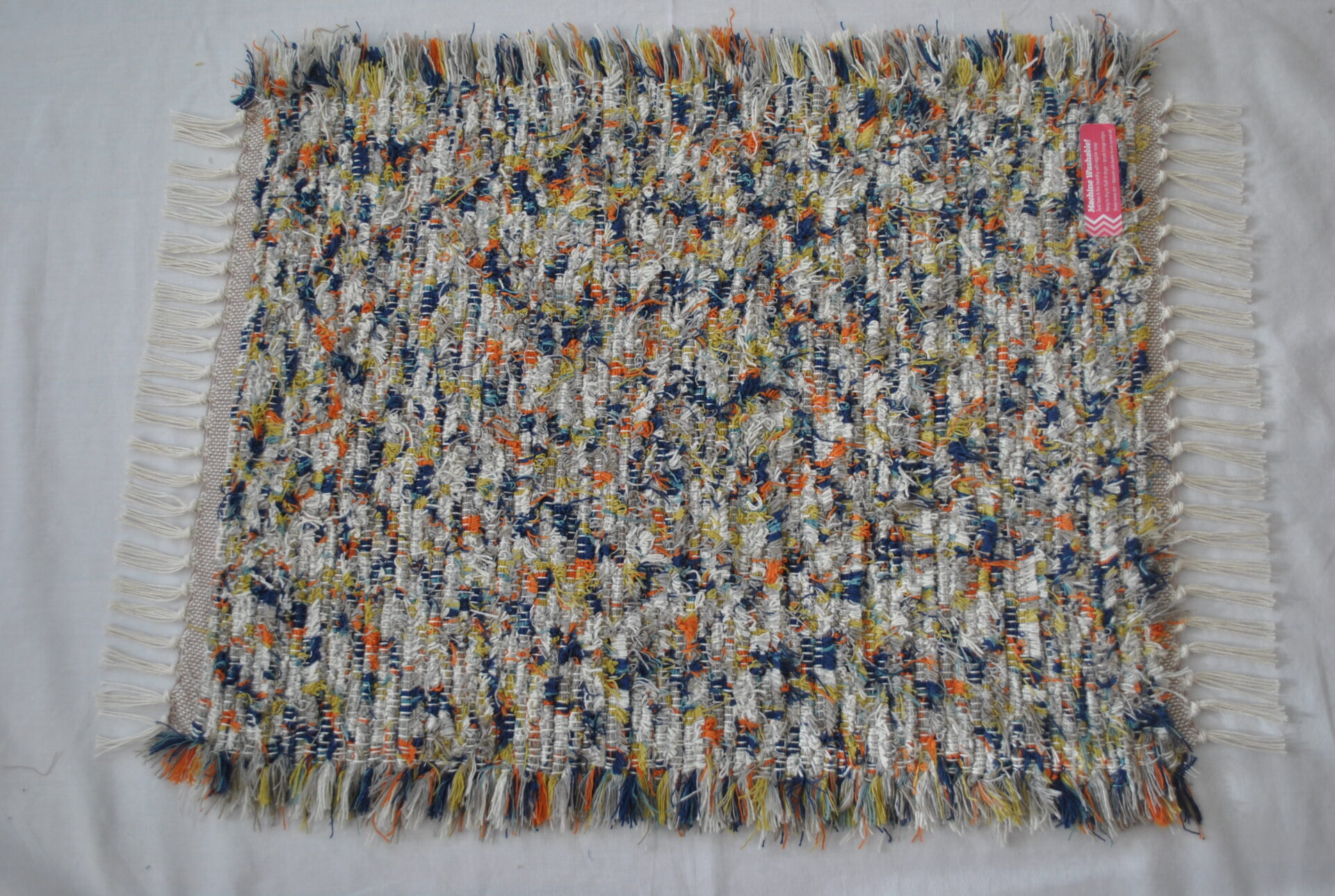 Catch the eye of everyone in your house by using this small but mighty mat at the door, in the bathroom or bedroom, or as a decor piece in a living space. The surprising colour swatches of navy blue, burnt orange, olive green, dark taupe, and medium ivory join in a speckle pattern that dances with life. Equally suitable for floor or table, it could be a hot pad during meal times or a fantastic plant holder. Use your imagine, maybe you’ll surprise yourself!