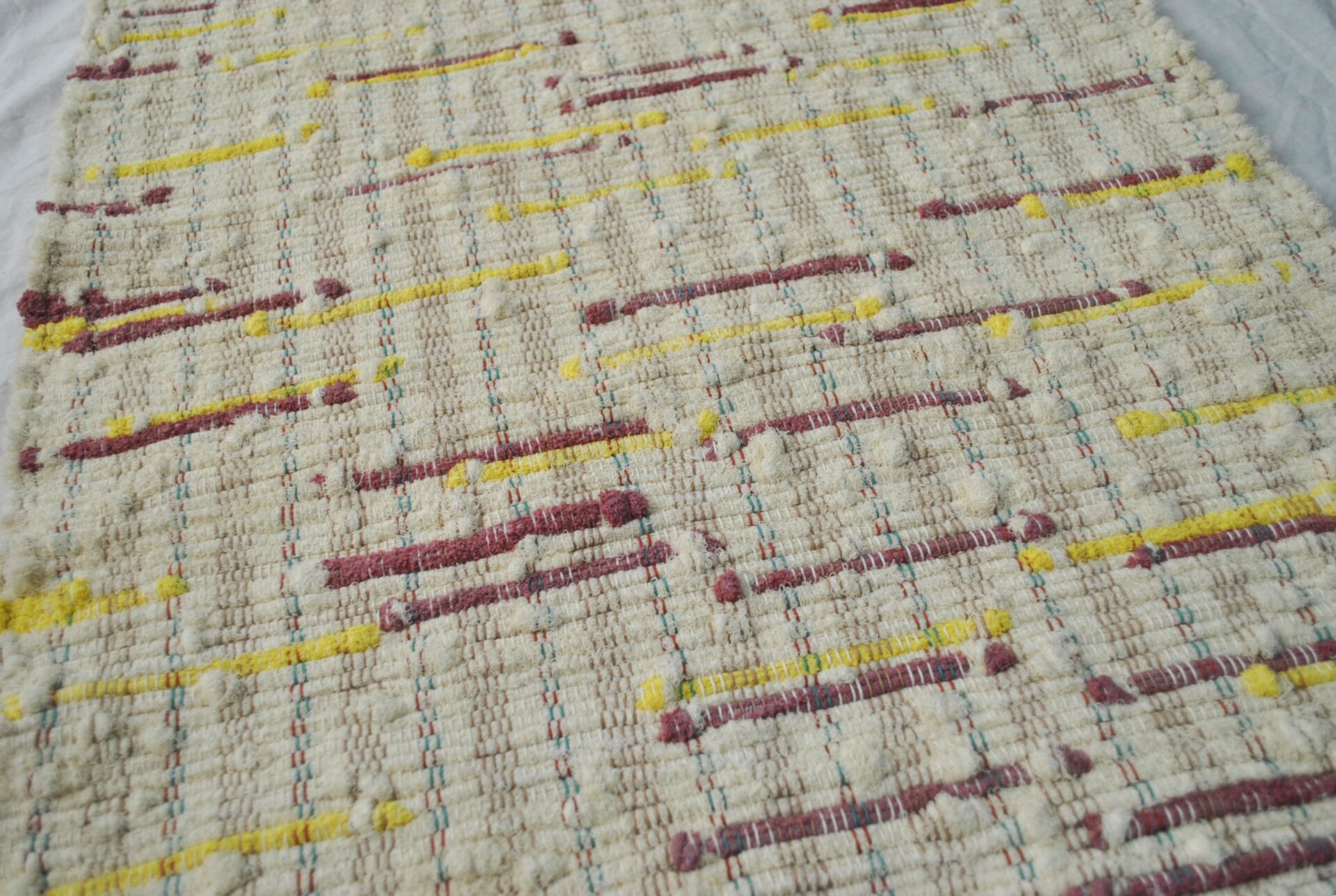 Looper Rugs are a family favourite, going back to the 1990’s when my Gramma discovered this upcycled weft item. In this medium-sized rug, small dusty rose strips are interspersed with pastel yellow on a creamy neutral background. Soft turquoise, warm cinnamon, and salmon-coloured warp strings further accent the soft palette. See the close-up photos for a look at the texture and thickness of this hearty, absorbent rug, and details of the similar looking 38×27 “Pastel Blend” rug are listed here.